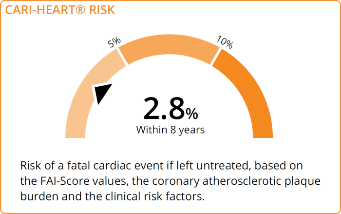 Η εξατομικευμένη βαθμολόγηση κινδύνου της ανάλυσης CaRi-Heart®, γνωστή ως CaRi-Heart Risk Score, είναι ένα προηγμένο εργαλείο πρόβλεψης που υπολογίζει την πιθανότητα του εξεταζόμενου να υποστεί ένα θανατηφόρο καρδιακό επεισόδιο μέσα στα επόμενα 8 χρόνια.