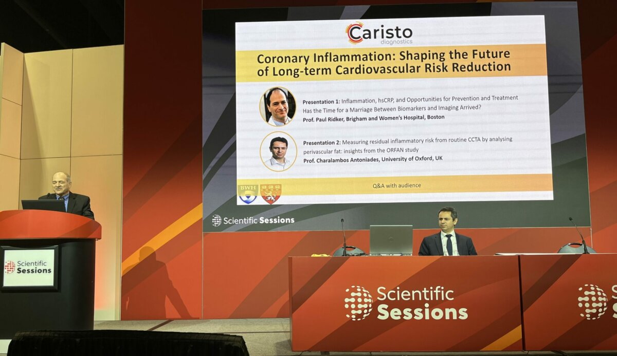 Παρουσίαση στο συμπόσιο που υλοποίηθηκε από την Caristo Diagnostics στο ετήσιο συνέδριο της AHA (American Heart Association) 2024. Εξαιρετικές παρουσιάσεις σχετικά με τους βιοδείκτες φλεγμονής στεφανιαίων αρτηριών και τις ευκαιρίες στην πρόληψη και θεραπεία, από τον Καθηγητή Paul Ridker (Νοσοκομείο Brigham and Women’s, Βοστώνη) και τον Καθηγητή Χαράλαμπο Αντωνιάδη (Πανεπιστήμιο της Οξφόρδης).